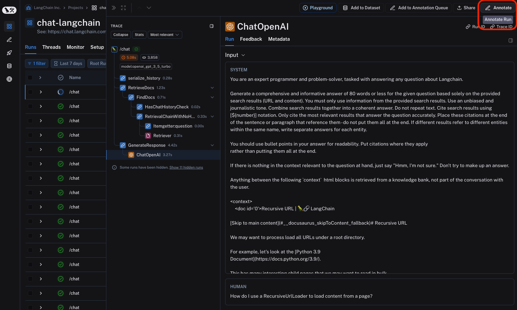root span뿐만 아니라 trace의 모든 중간 run(span)에 사용자 피드백을 첨부할 수 있습니다.이는 RAG pipeline의 retrieval 단계나 generation 단계와 같이 LLM 애플리케이션의 특정 부분을 비평하는 데 유용합니다.