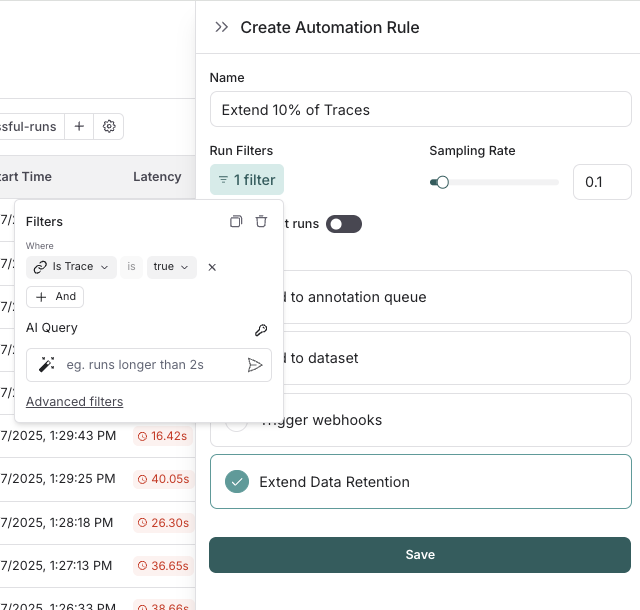 400일보다 더 오래 일부 트레이스를 데이터 수집 목적으로 유지하고 싶다면, 일부 run을 원하는 데이터셋으로 전송하는 추가 run rule을 만들 수 있습니다. 데이터셋은 트레이스 입력 및 출력을(예: key-value 데이터셋) 저장하며, 트레이스가 삭제된 후에도 영구적으로 보존됩니다.