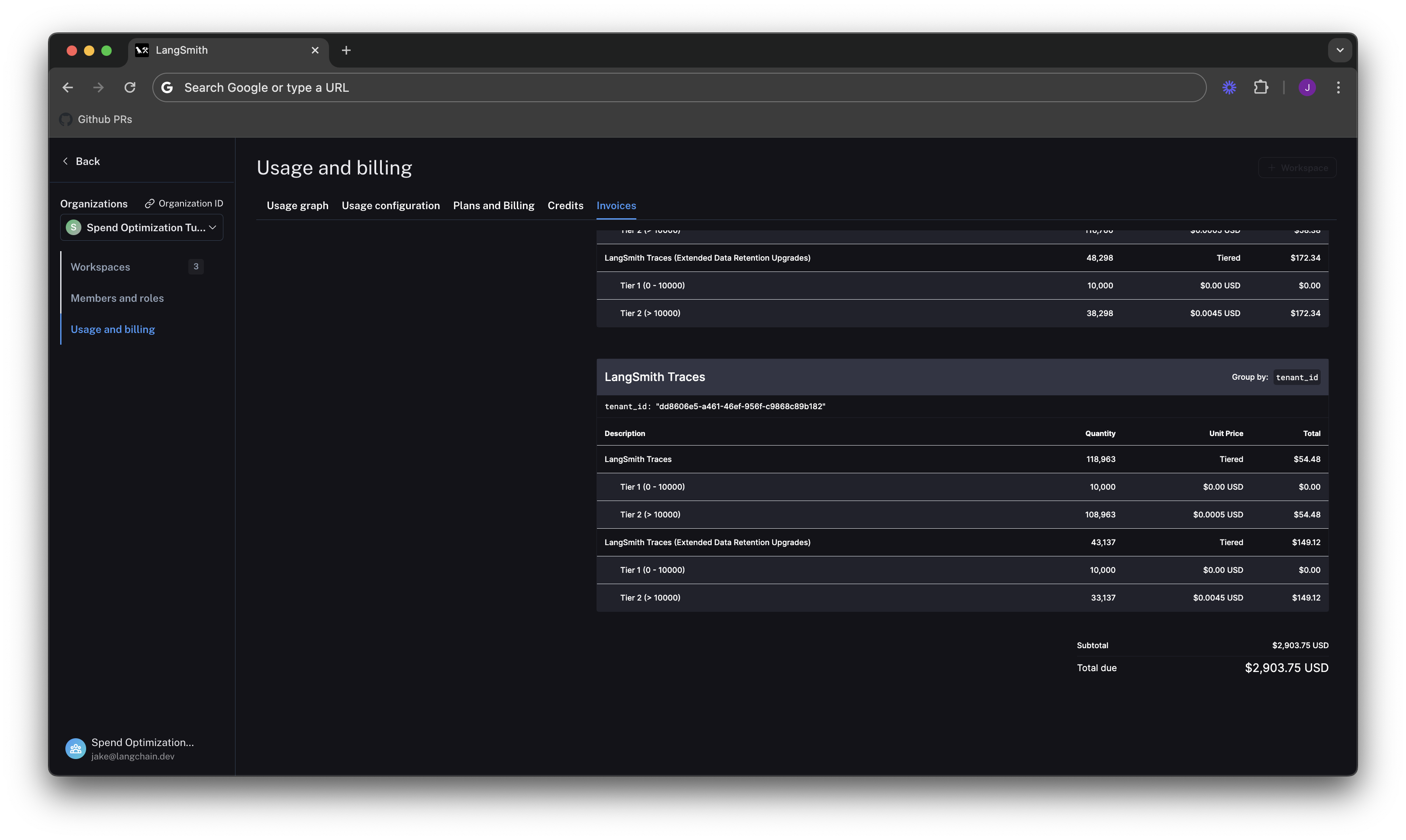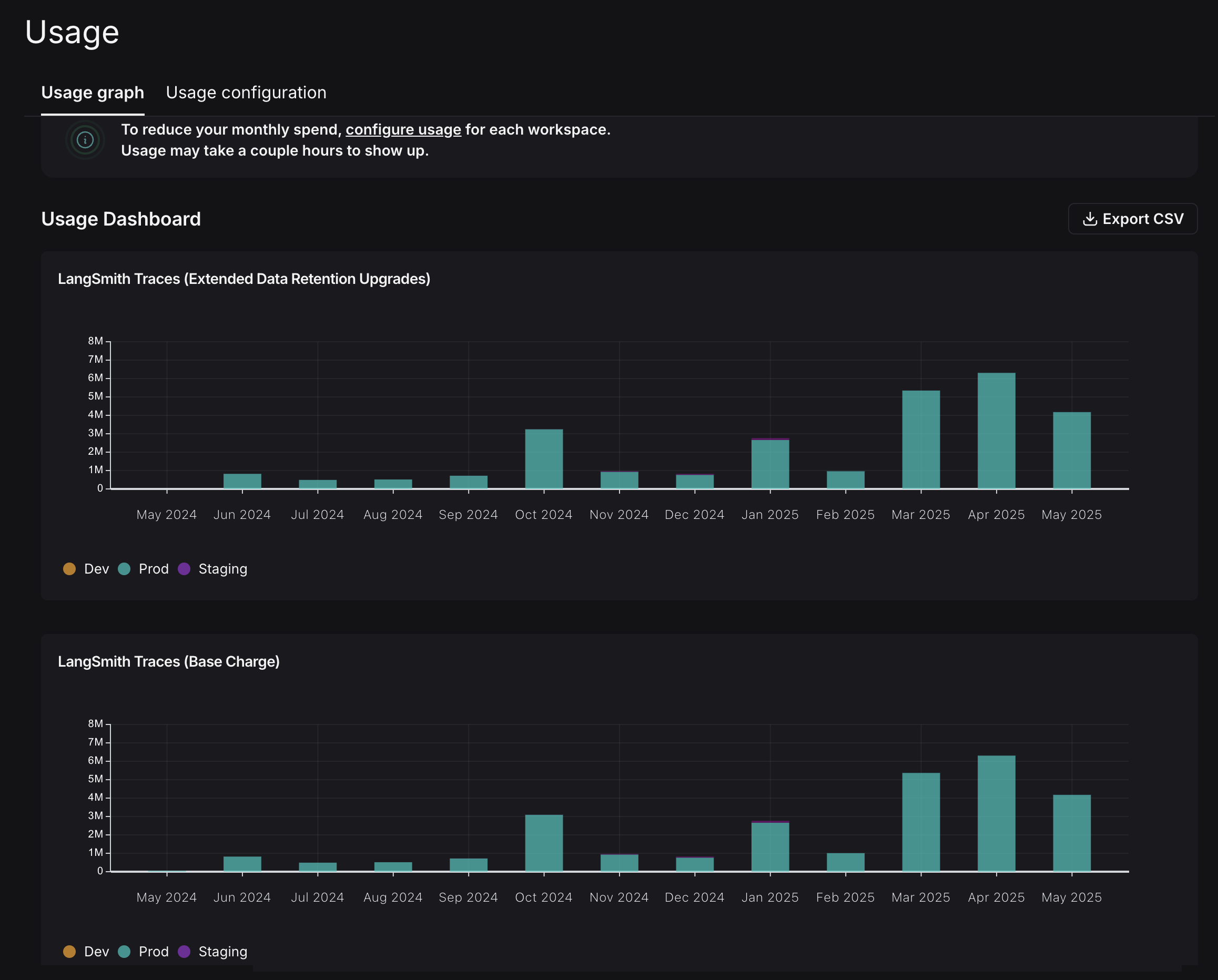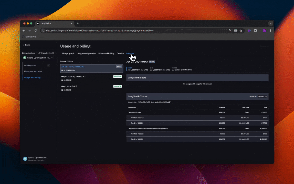 최적화 프로세스의 첫 단계는 현재 사용량을 파악하는 것입니다. LangSmith에서는 사용량 그래프와 청구서 두 가지 방법을 제공합니다.사용량 그래프