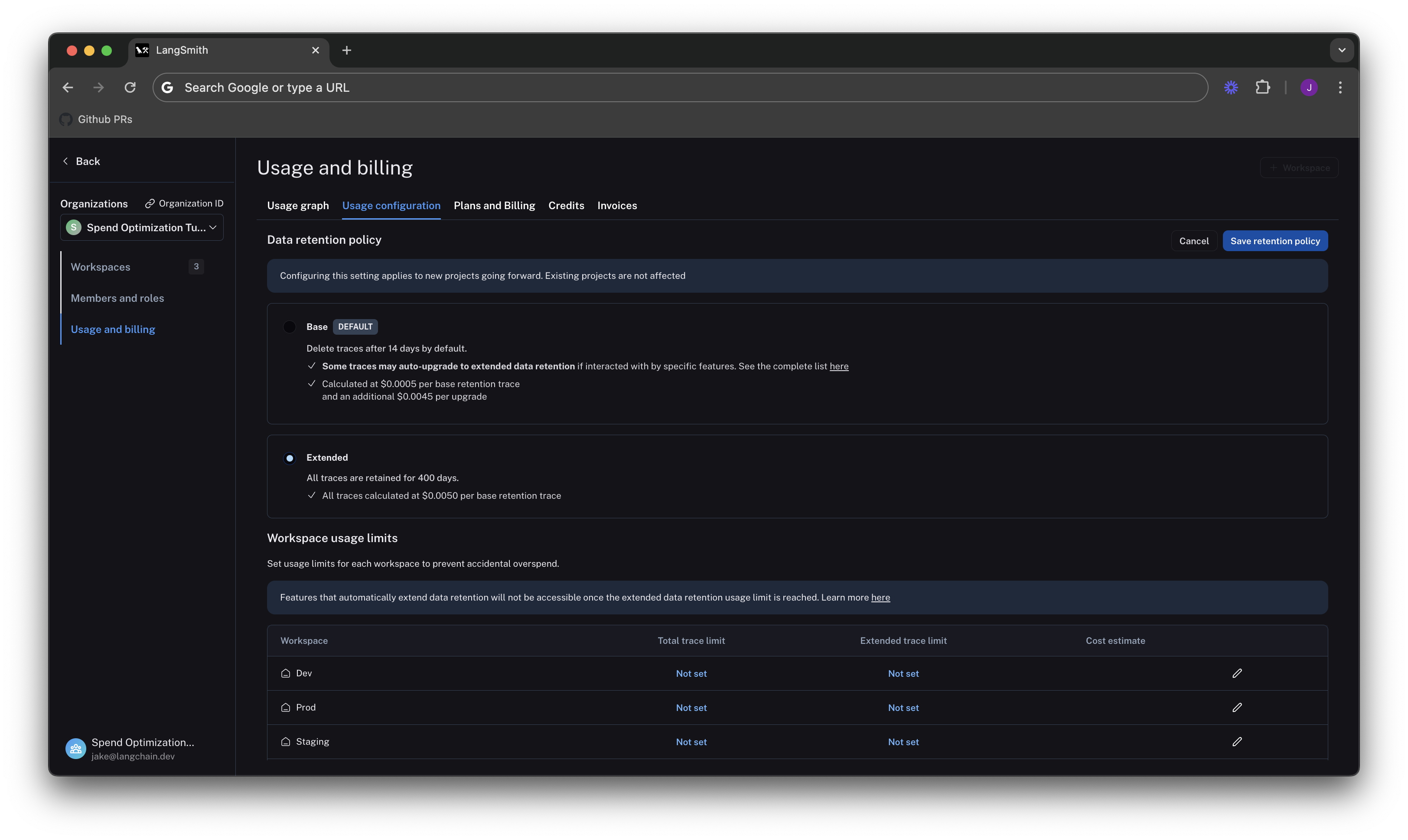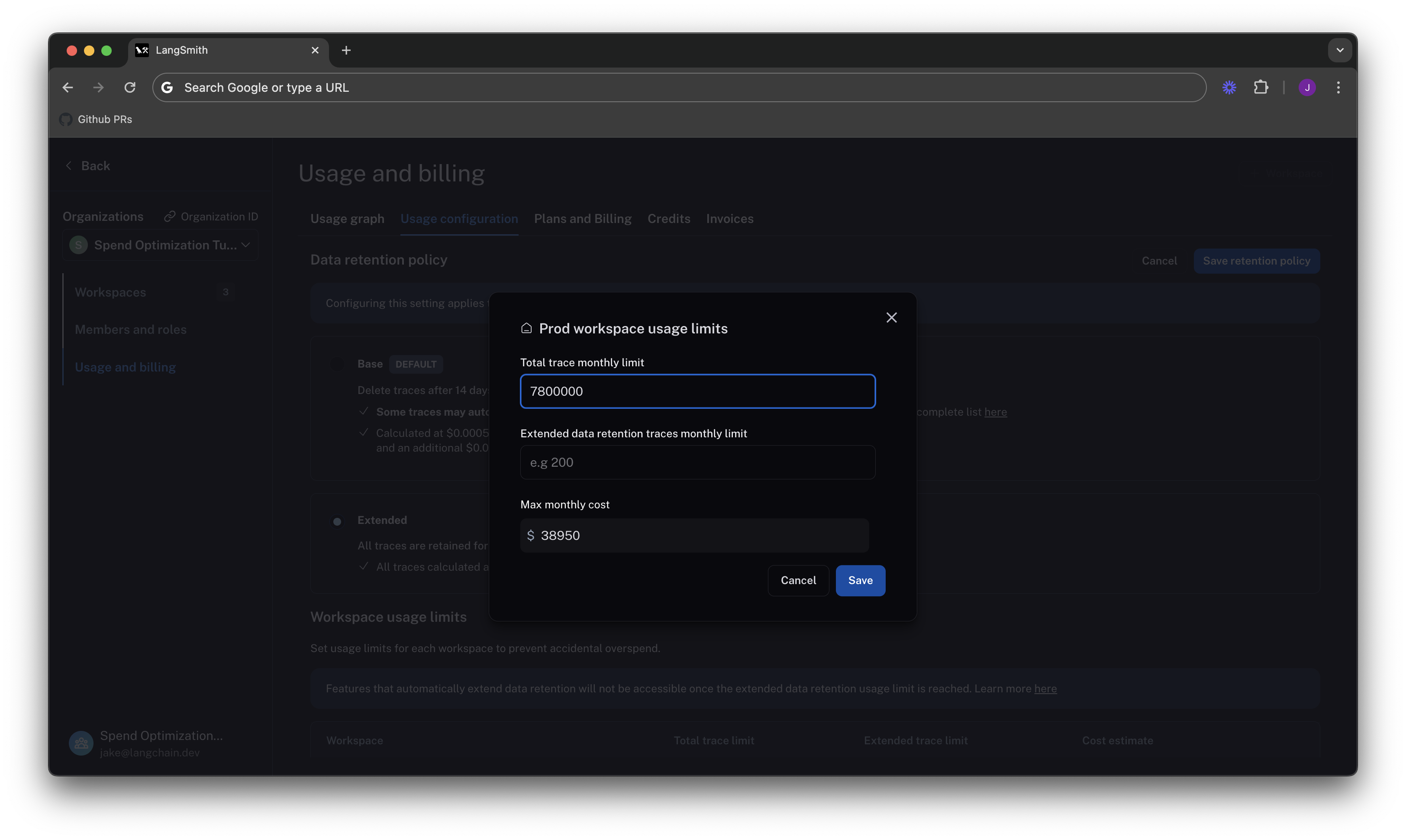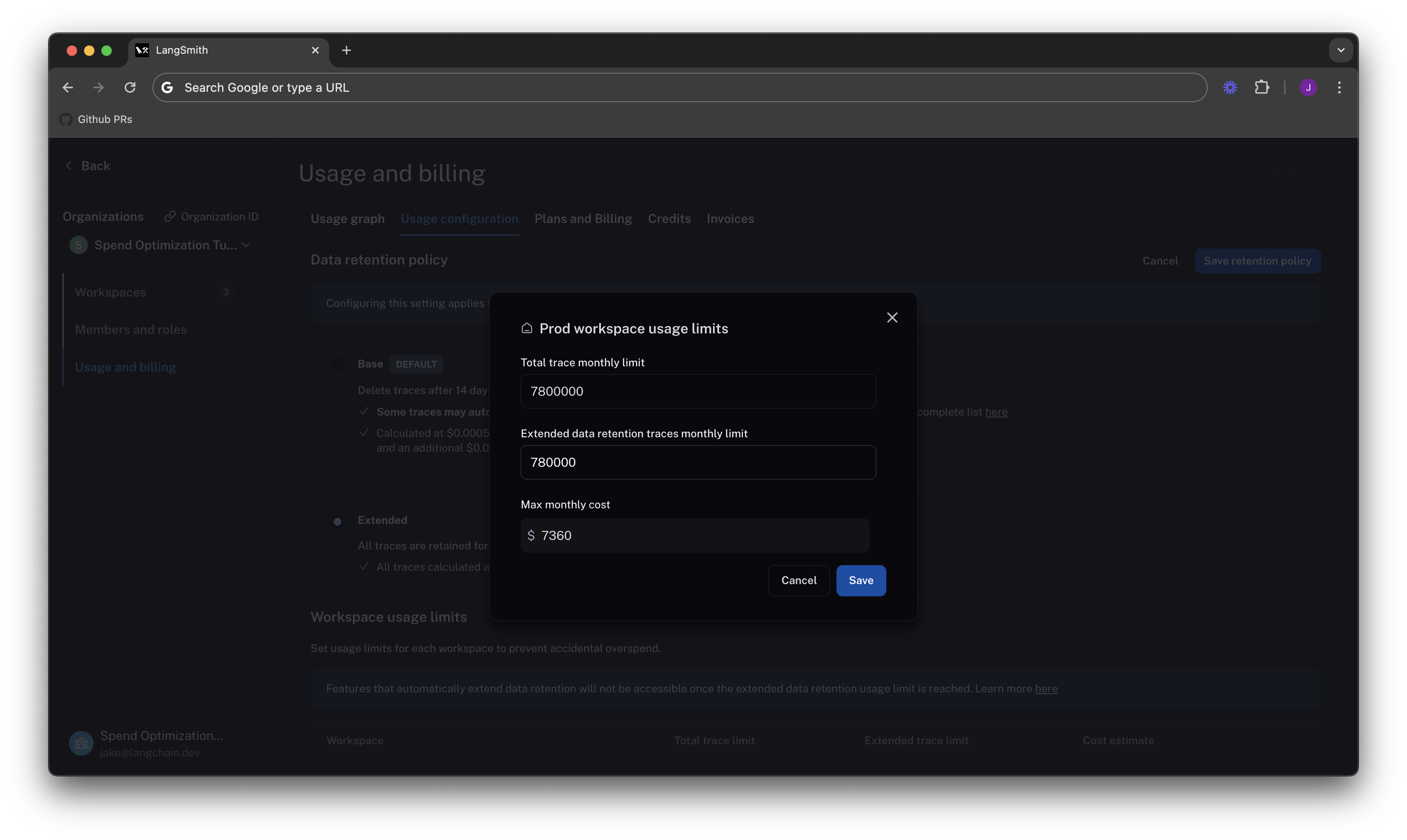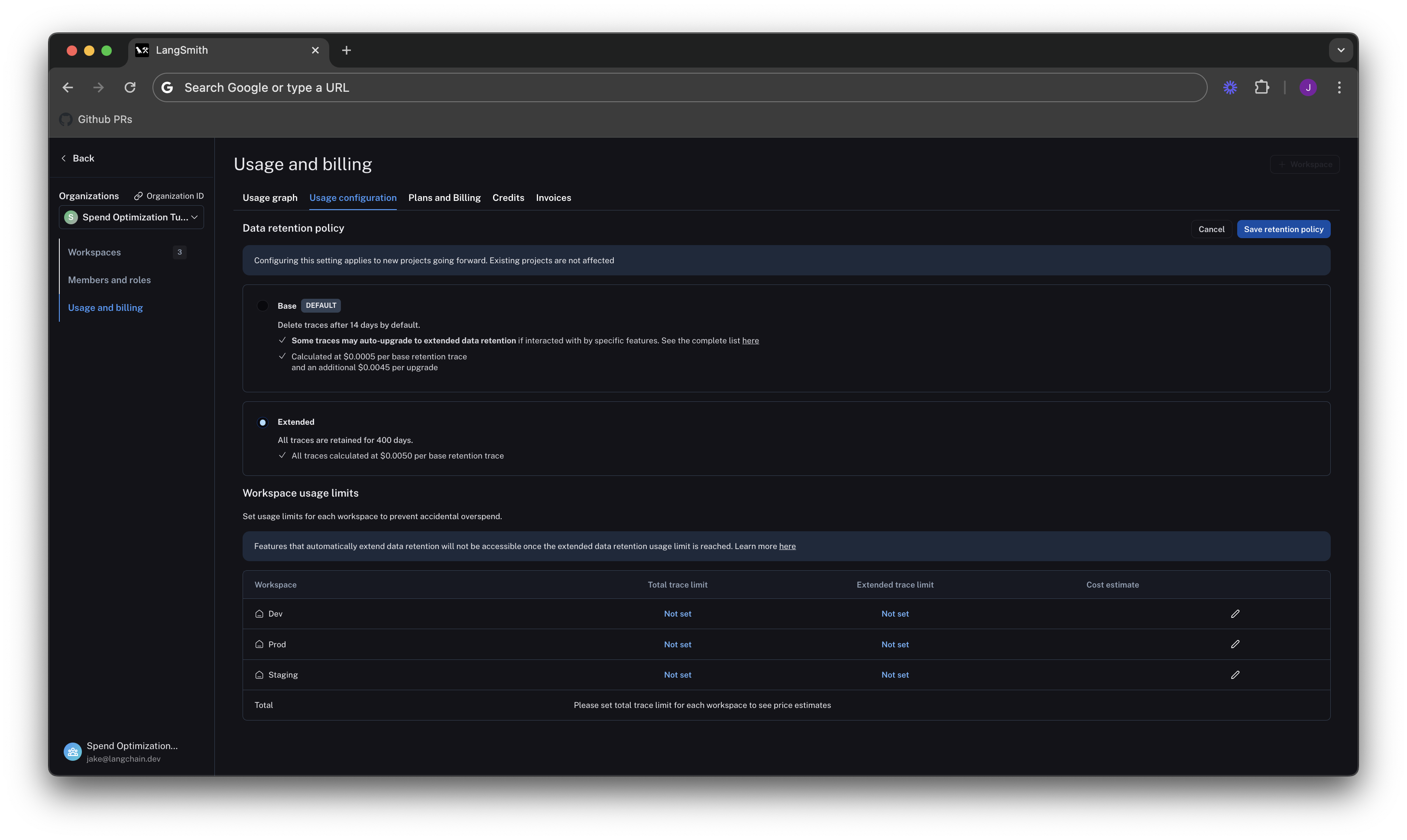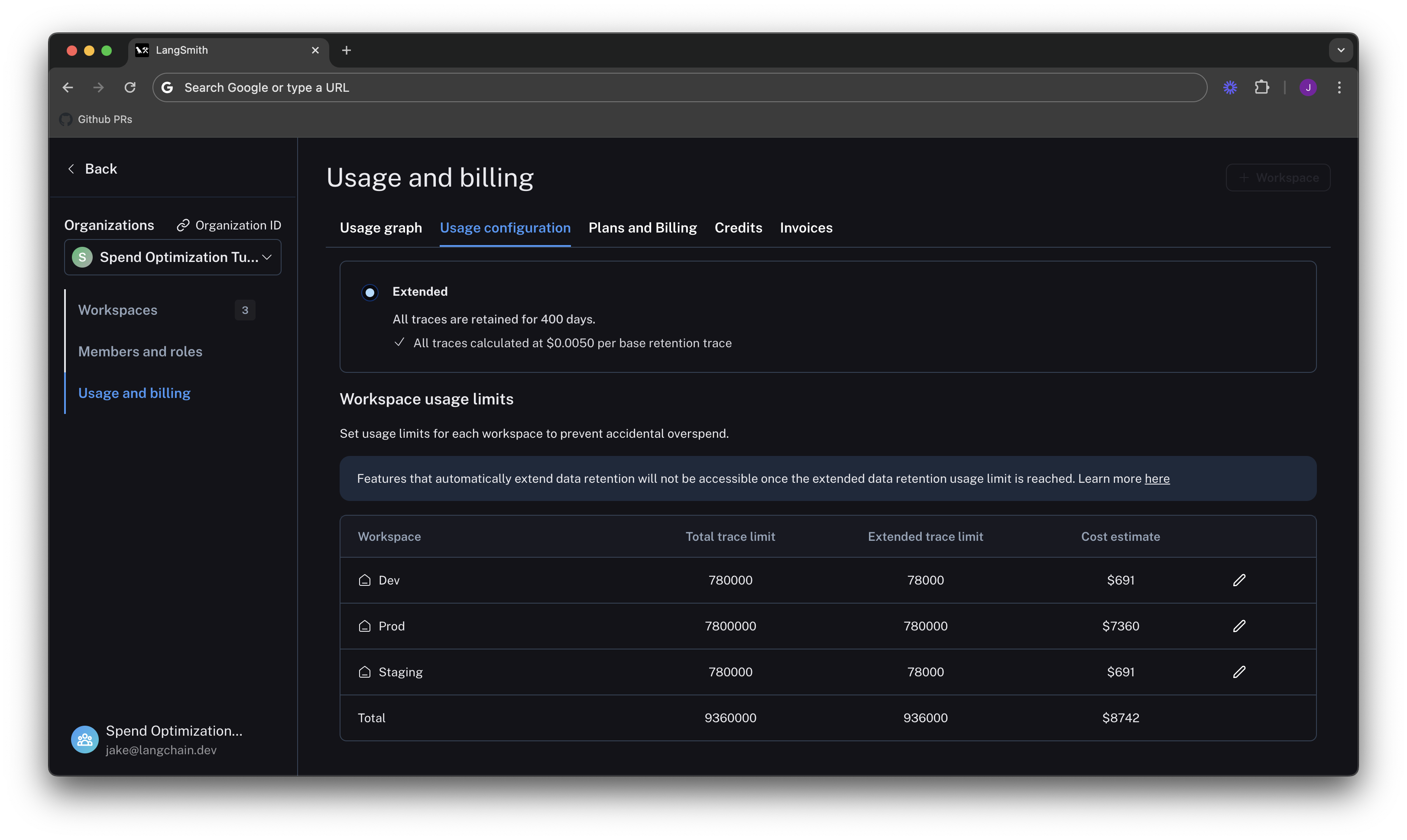 이전 섹션에서는 데이터 보존 설정을 관리하여 기존 비용을 최적화했습니다. 이번 섹션에서는 사용량 제한을 통해 미래의 과도한 지출을 방지합니다. LangSmith에는 두 가지 사용량 제한이 있습니다: 전체 트레이스와 extended retention 트레이스. 이는 사용량 그래프에서 추적되는 두 가지 지표에 해당합니다. 두 제한을 함께 사용하면 비용을 세밀하게 제어할 수 있습니다. 제한을 설정하려면 Settings -> Usage and Billing -> Usage configuration으로 돌아가세요. 페이지 하단의 표에서 워크스페이스별로 사용량 제한을 설정할 수 있습니다. 각 워크스페이스별로 두 가지 제한과 비용 추정치가 표시됩니다.