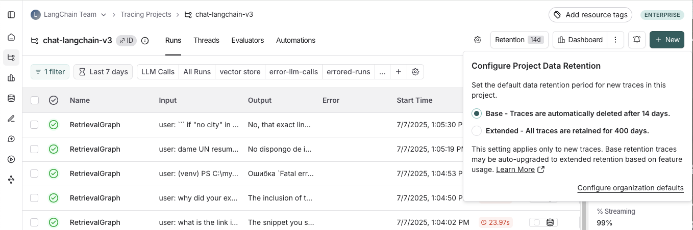 LangSmith는 트레이스의 데이터 보존 기간에 따라 요금을 다르게 부과합니다. 단기 보존 트레이스는 장기 보존 트레이스보다 훨씬 저렴합니다. 이 최적화에서는 과거 데이터 관찰성을 희생하지 않으면서 데이터 보존 설정을 최적화하는 방법과 그 효과를 확인합니다.신규 프로젝트의 조직 수준 보존 기본값 변경