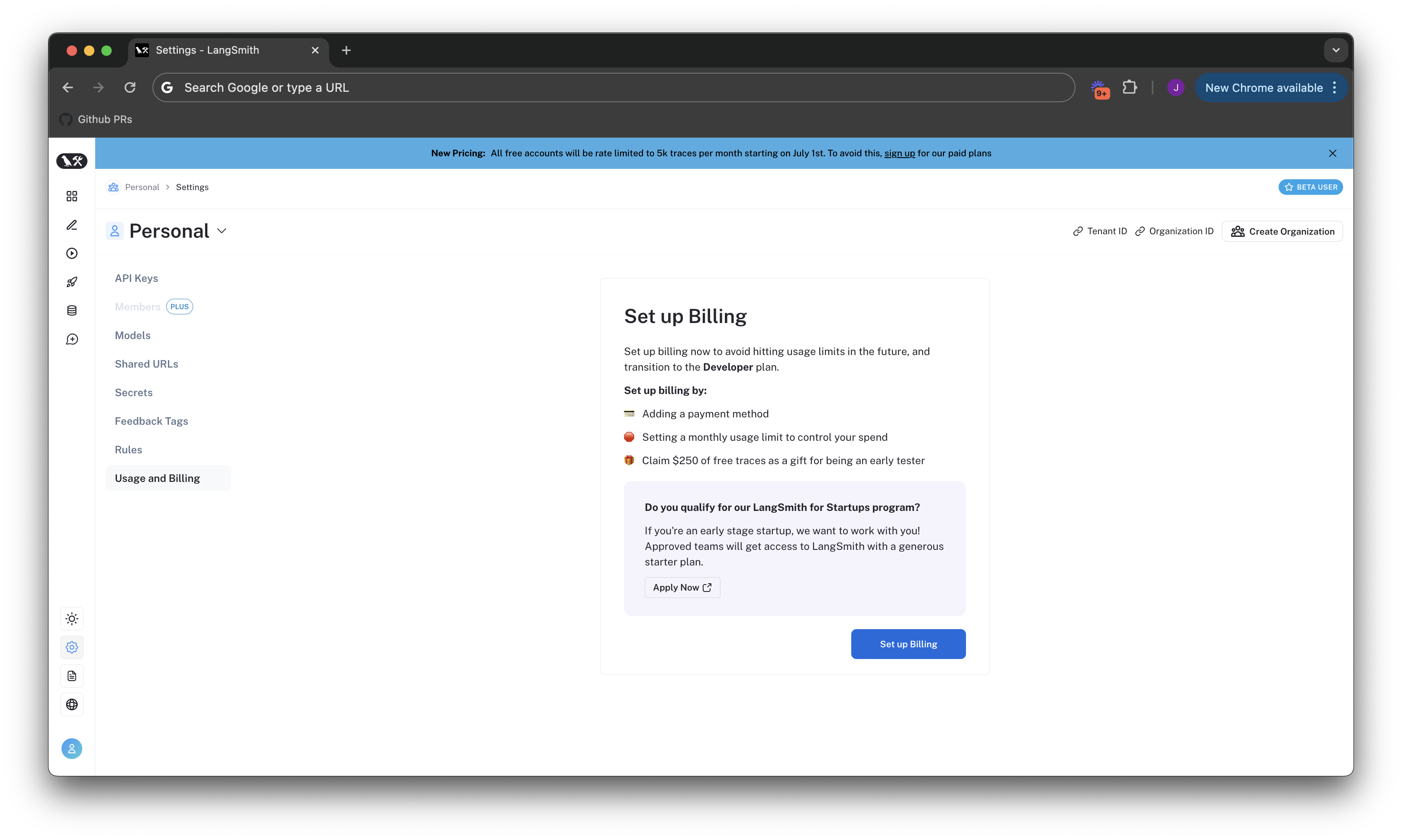 2024년 4월 2일 가격 정책 도입 이전에 LangSmith에 가입했다면, 기존 계정을 업그레이드하여 결제를 설정할 수 있습니다. 2024년 7월 8일까지 결제를 설정하지 않았다면, 계정은 월 최대 5,000 트레이스로 제한됩니다.- Settings 페이지로 이동하세요.