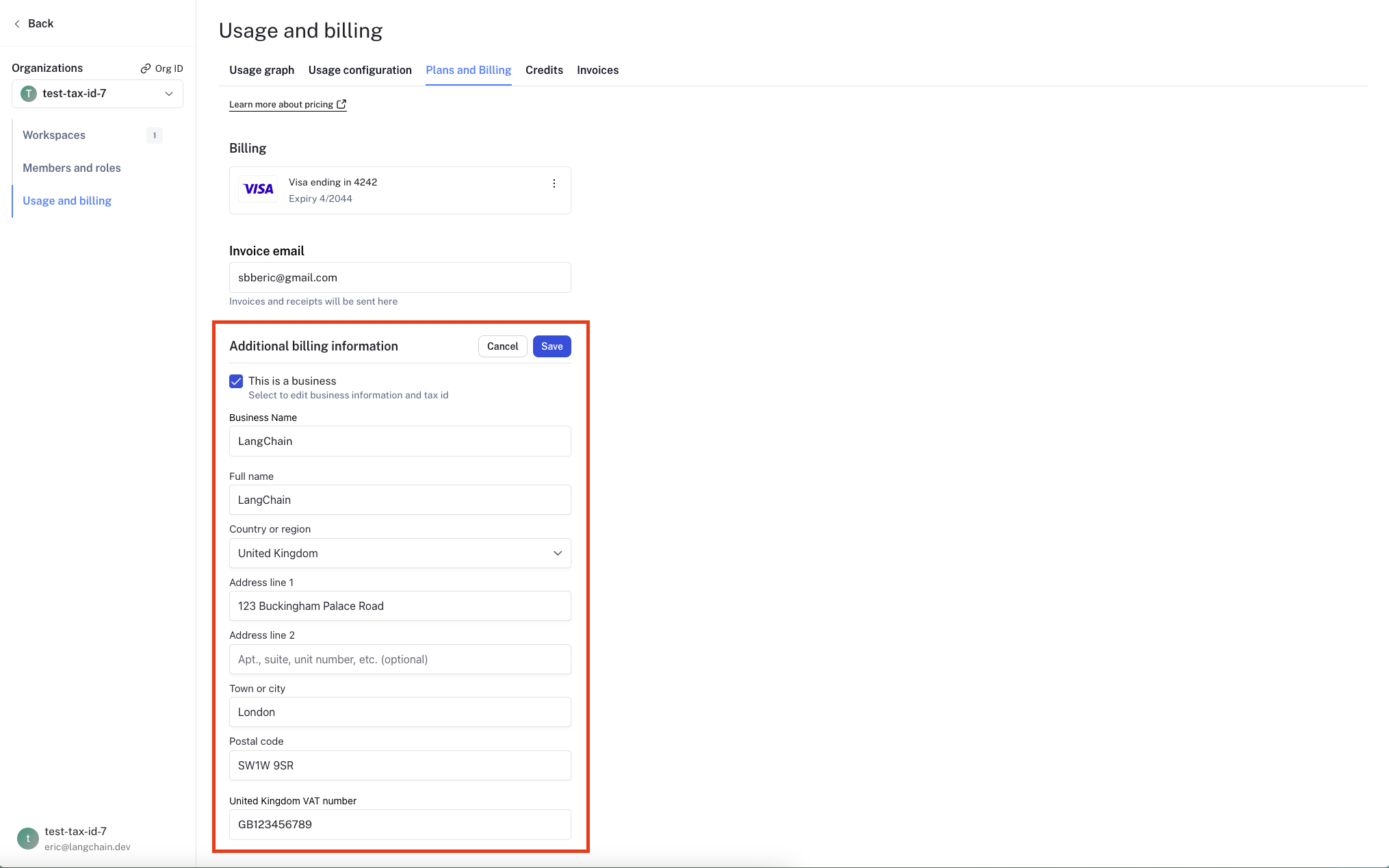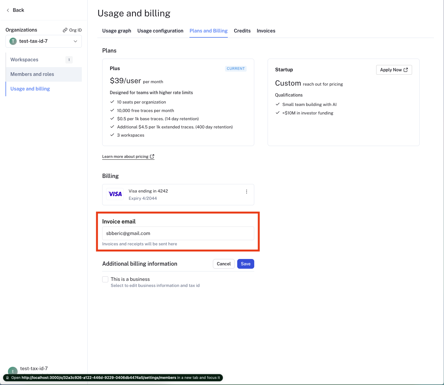 LangSmith 조직의 사업자 정보를 업데이트하려면 Settings의 Usage and Billing 페이지에서 Plans and Billing 탭을 클릭하세요.사업자 정보, 세금 ID, 청구서 이메일은 Plus 및 Startup 플랜에서만 업데이트할 수 있습니다. Free 및 Developer 플랜에서는 이 정보를 수정할 수 없습니다.