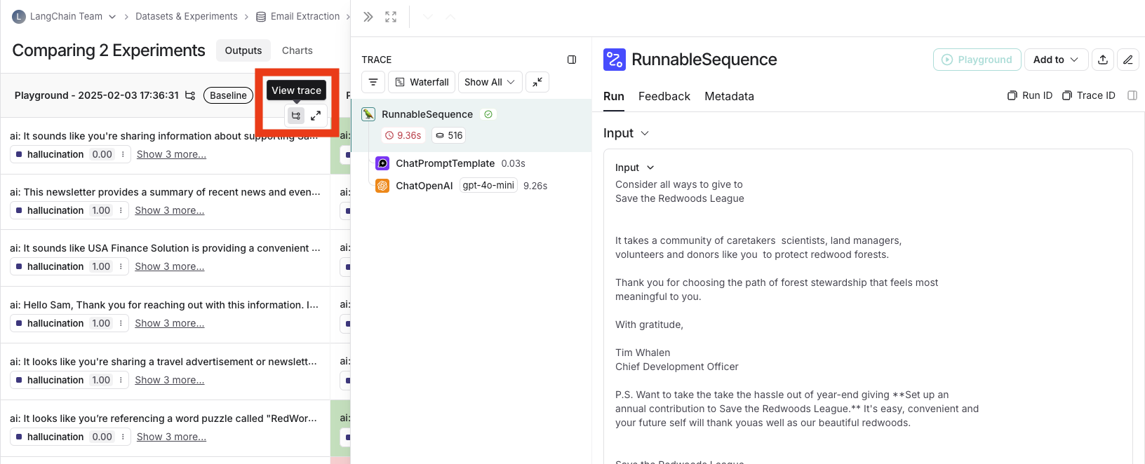 평가 중인 example이 수집된 run에서 가져온 것이라면, output cell 위에 마우스를 올리고 trace 아이콘을 클릭하여 해당 run의 trace 뷰를 열 수 있습니다. 그러면 사이드 패널에 trace가 열립니다.