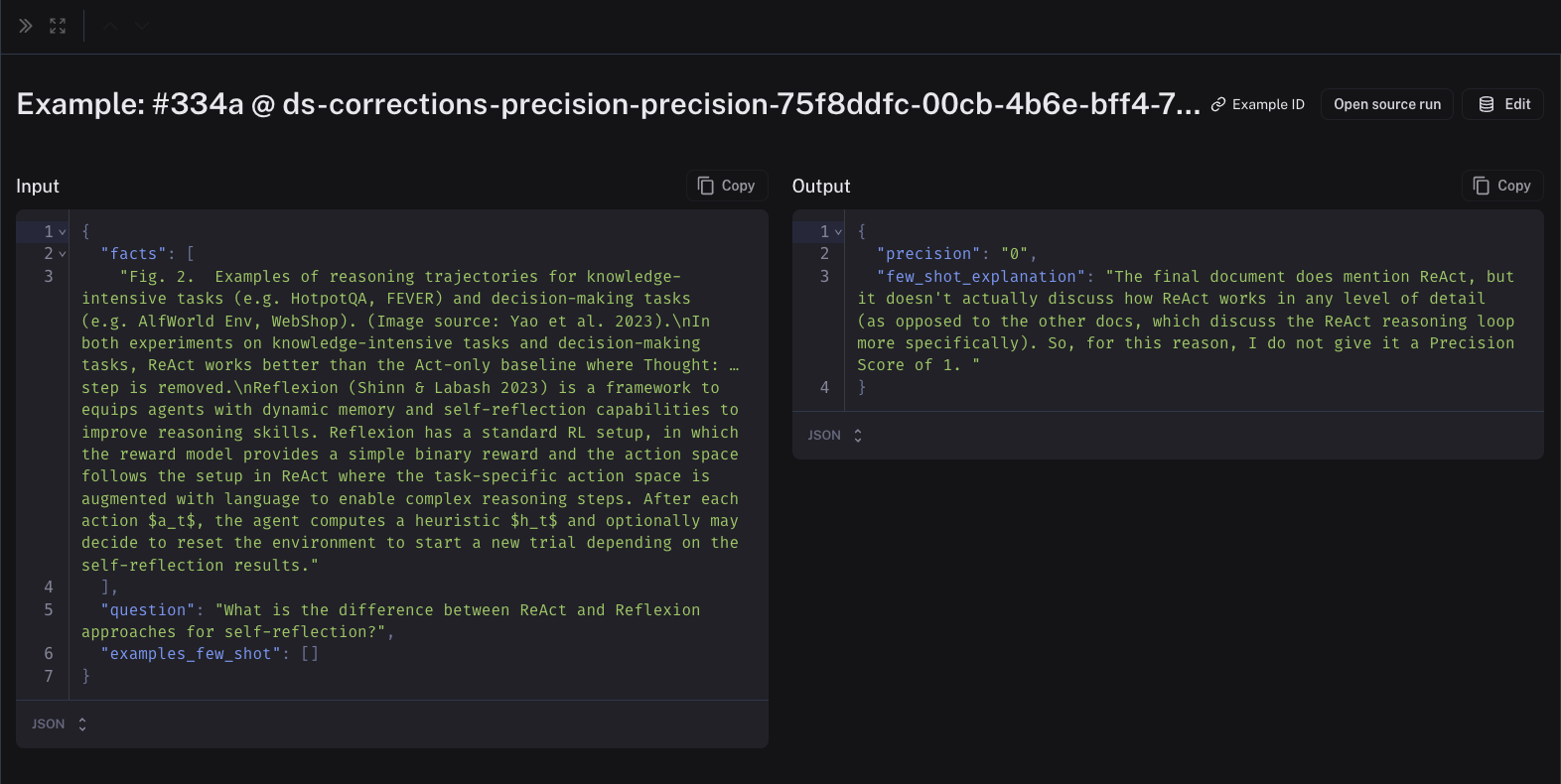 Few-shot 예제의 input은 chain/dataset의 input, output, reference(offline 평가자인 경우)에서 관련 필드가 됩니다. Output은 수정된 평가자 점수와 수정 사항을 남길 때 작성한 설명이 됩니다. 원하는 대로 자유롭게 편집하세요. 다음은 corrections dataset의 few-shot 예제 예시입니다: