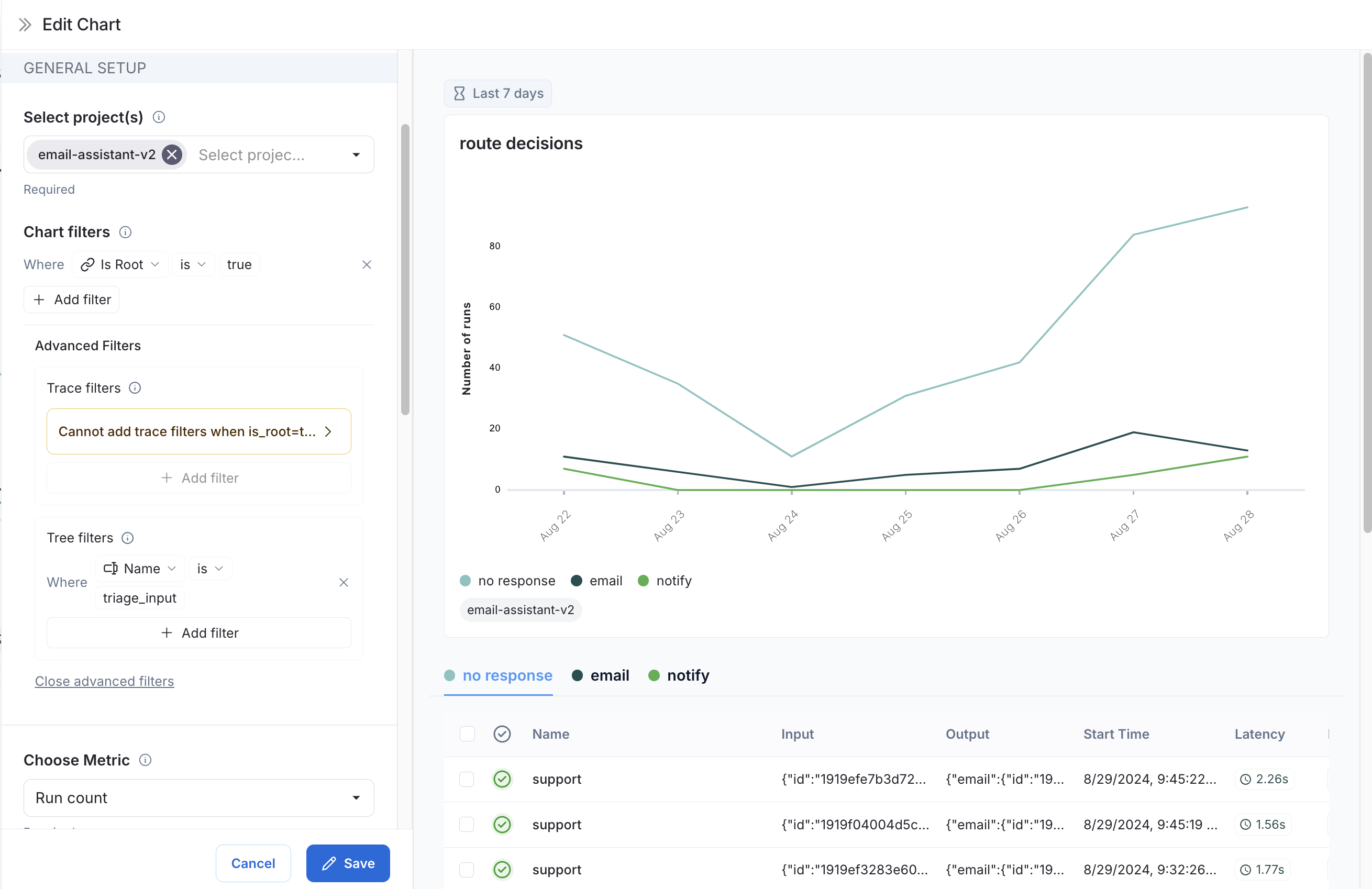triage_input인 모든 trace를 포함하도록 tree 필터를 추가합니다. 이는triage_input노드에 도달한 trace만 포함한다는 의미입니다. 또한Is Root가true인 차트 필터를 추가하여 trace의 노드 수로 인해 count가 부풀려지지 않도록 합니다.