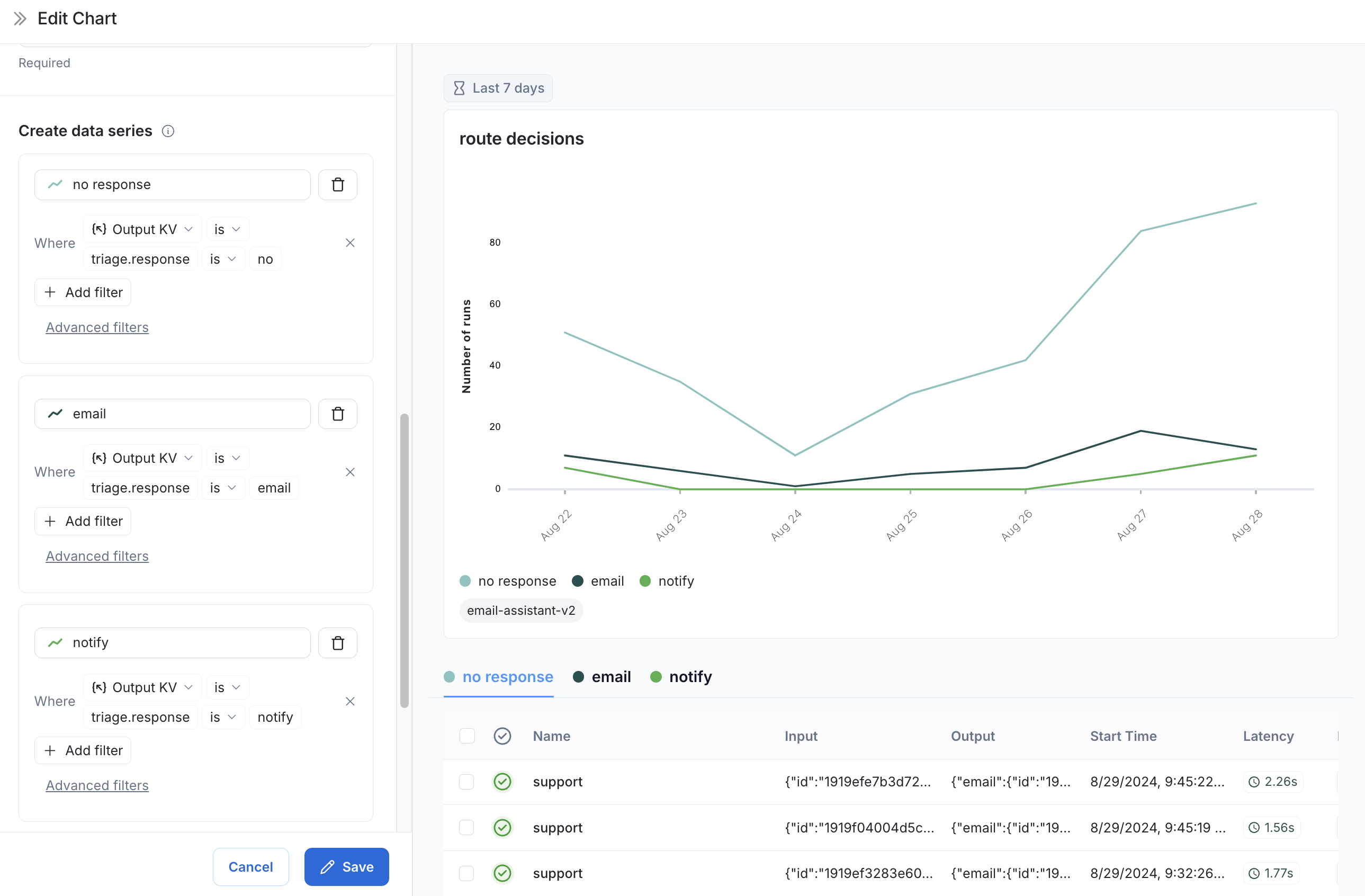 triage_input노드에서 내린 각 결정에 대한 데이터 시리즈를 생성합니다. 결정의 출력은 output 객체의triage.response필드에 저장되며, 결정 값은no,email또는notify입니다. 이러한 각 결정은 차트에서 별도의 데이터 시리즈를 생성합니다.