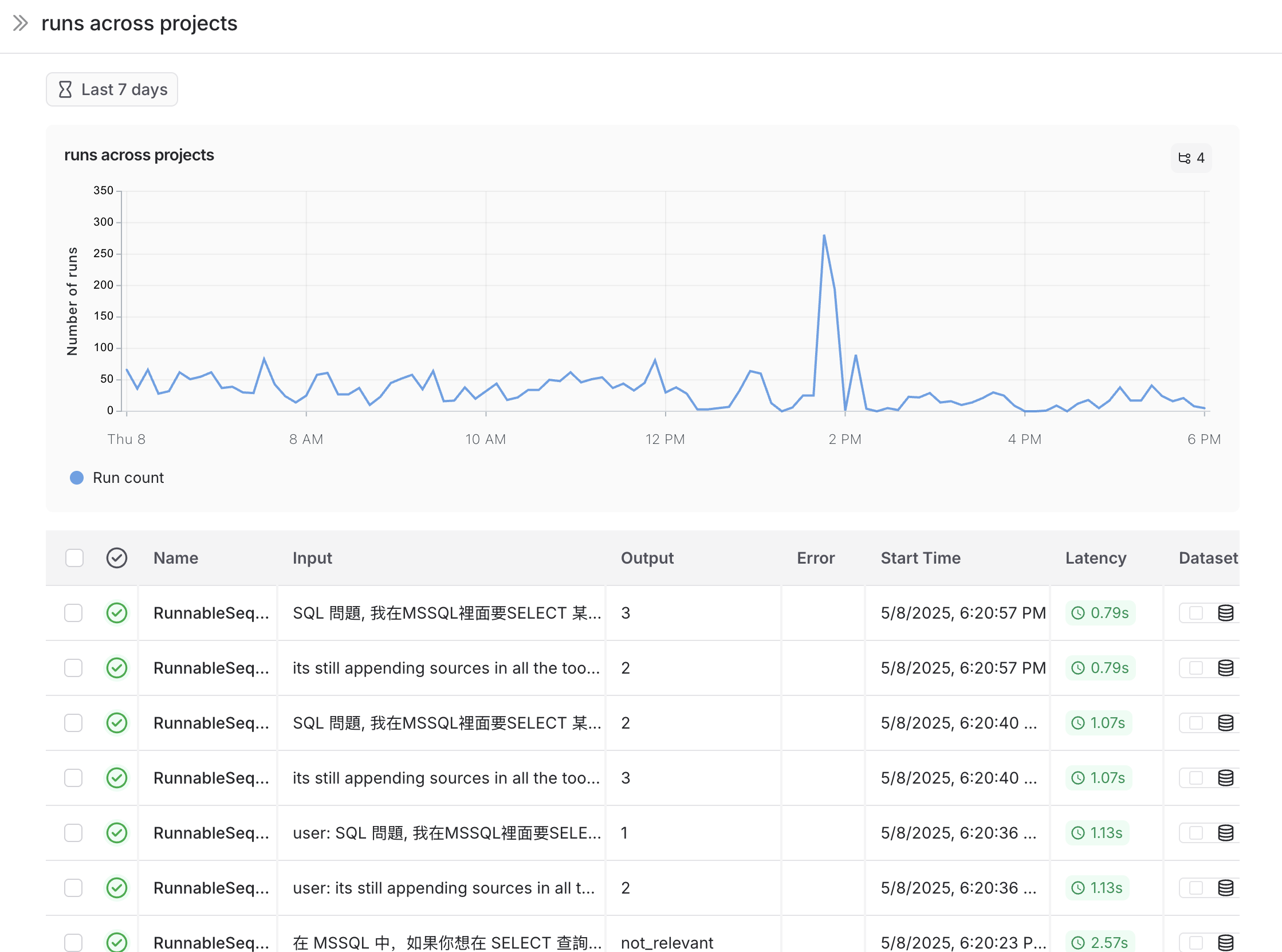 | Run Types | root run의 직계 자식인 run의 run 수, 오류율 및 지연 시간 통계. 이는 agent의 높은 수준의 실행 경로를 이해하는 데 도움이 됩니다. 가장 자주 발생하는 상위 5개 run 이름으로 제한됩니다. 이 표 다음의 이미지를 참조하세요. |