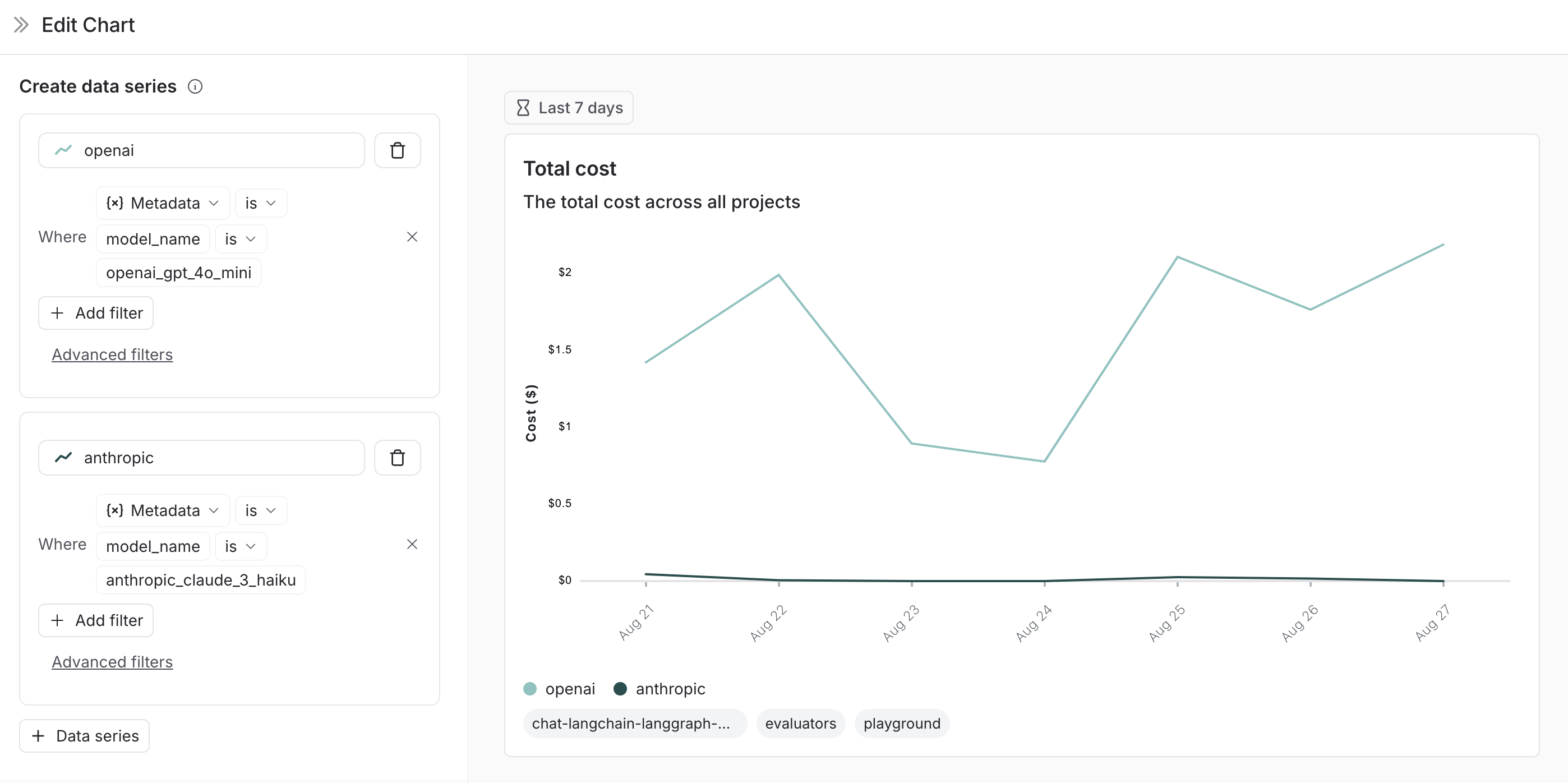 - 특정 메트릭(예: 지연 시간, token 사용량, 비용)의 경우 동일한 단위를 가진 여러 메트릭을 비교할 수 있습니다. 예를 들어, prompt token과 completion token을 볼 수 있는 하나의 차트를 원할 수 있습니다. 각 메트릭은 별도의 선으로 표시됩니다.