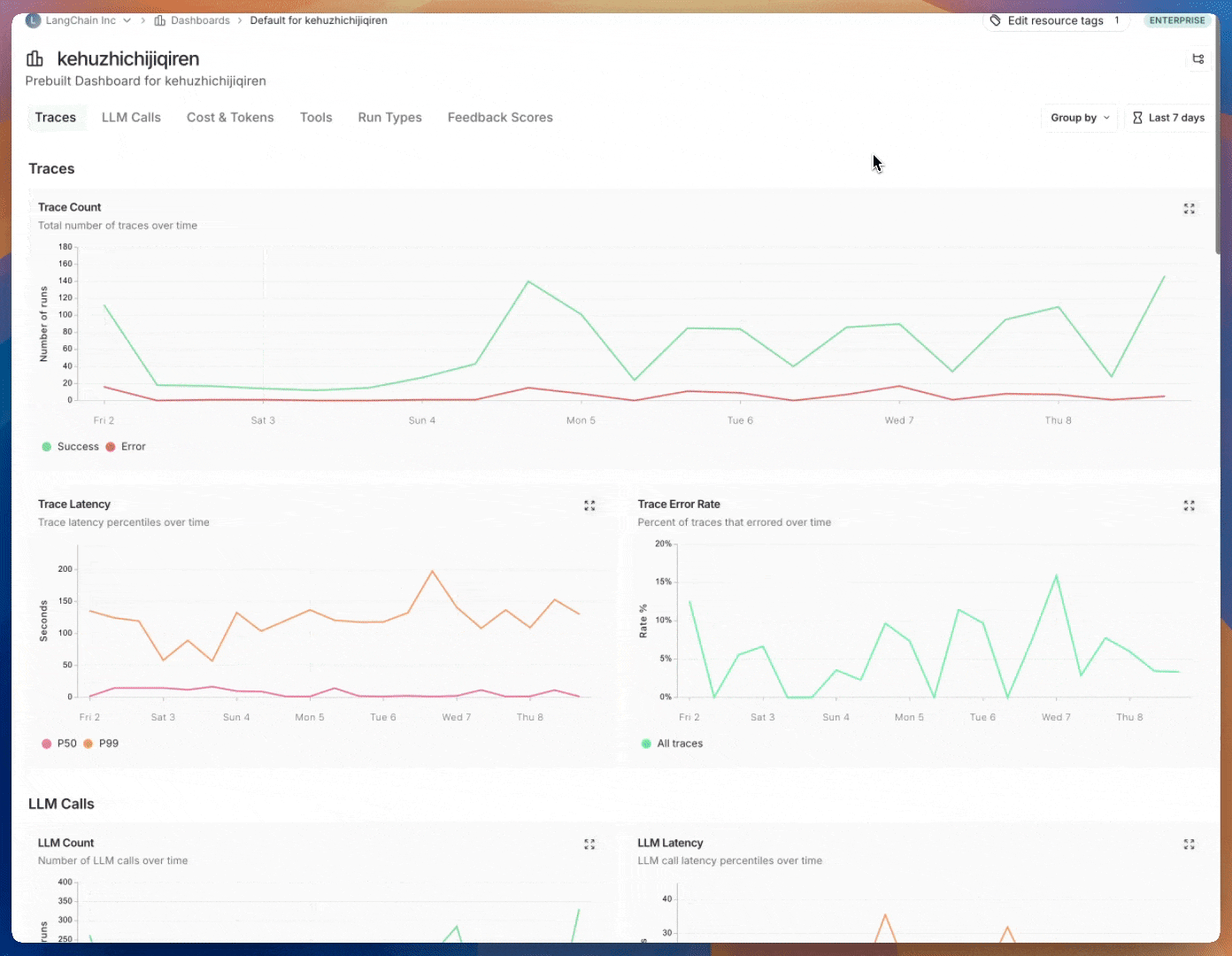 - 사전 구축 대시보드: 모든 tracing 프로젝트에 대해 자동으로 생성됩니다.