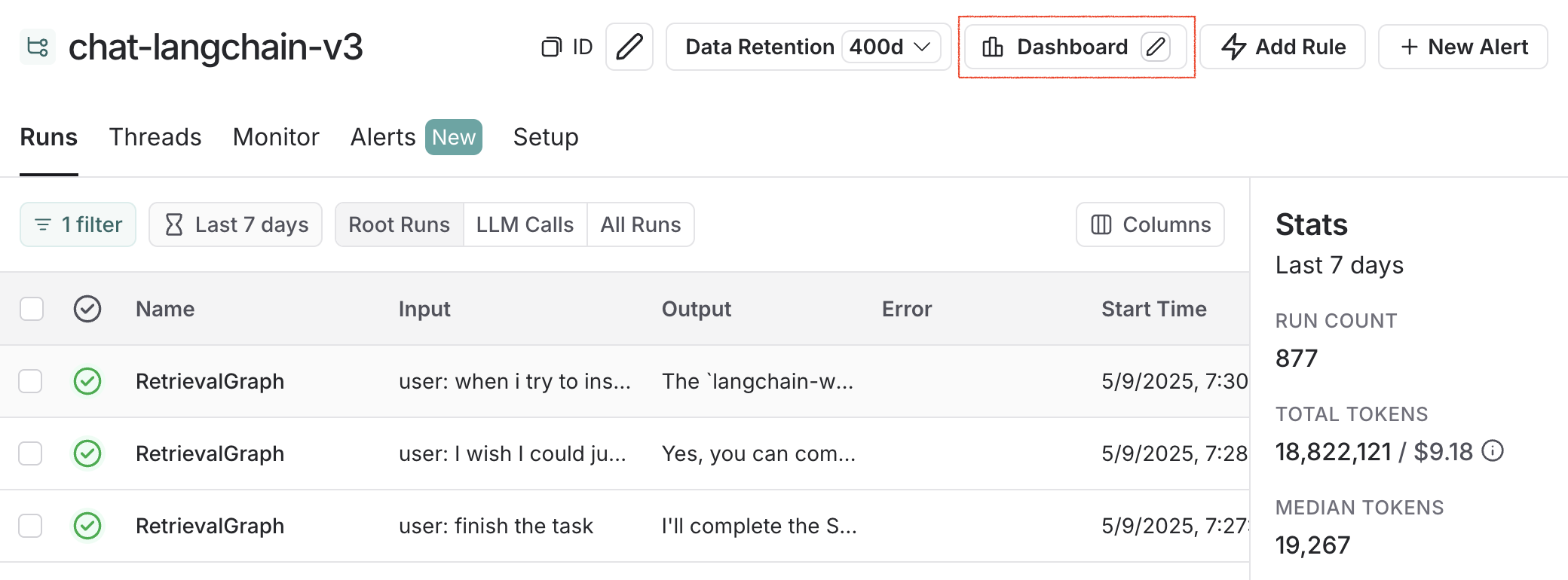 | Cost & Tokens | token 유형별로 분류된 총 token 수 및 trace당 token 수와 비용. 비용은 LangSmith의 비용 추적을 사용하여 측정됩니다. |