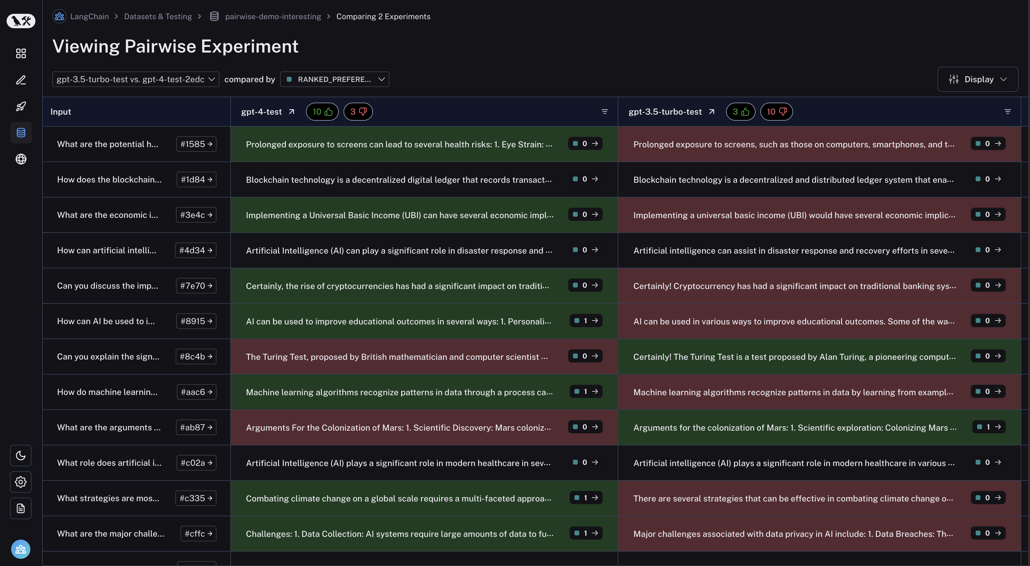 evaluate()를 사용하여 evaluator를 정의하고 pairwise evaluation을 실행합니다. 마지막으로 LangSmith UI를 사용하여 pairwise experiment를 확인합니다.