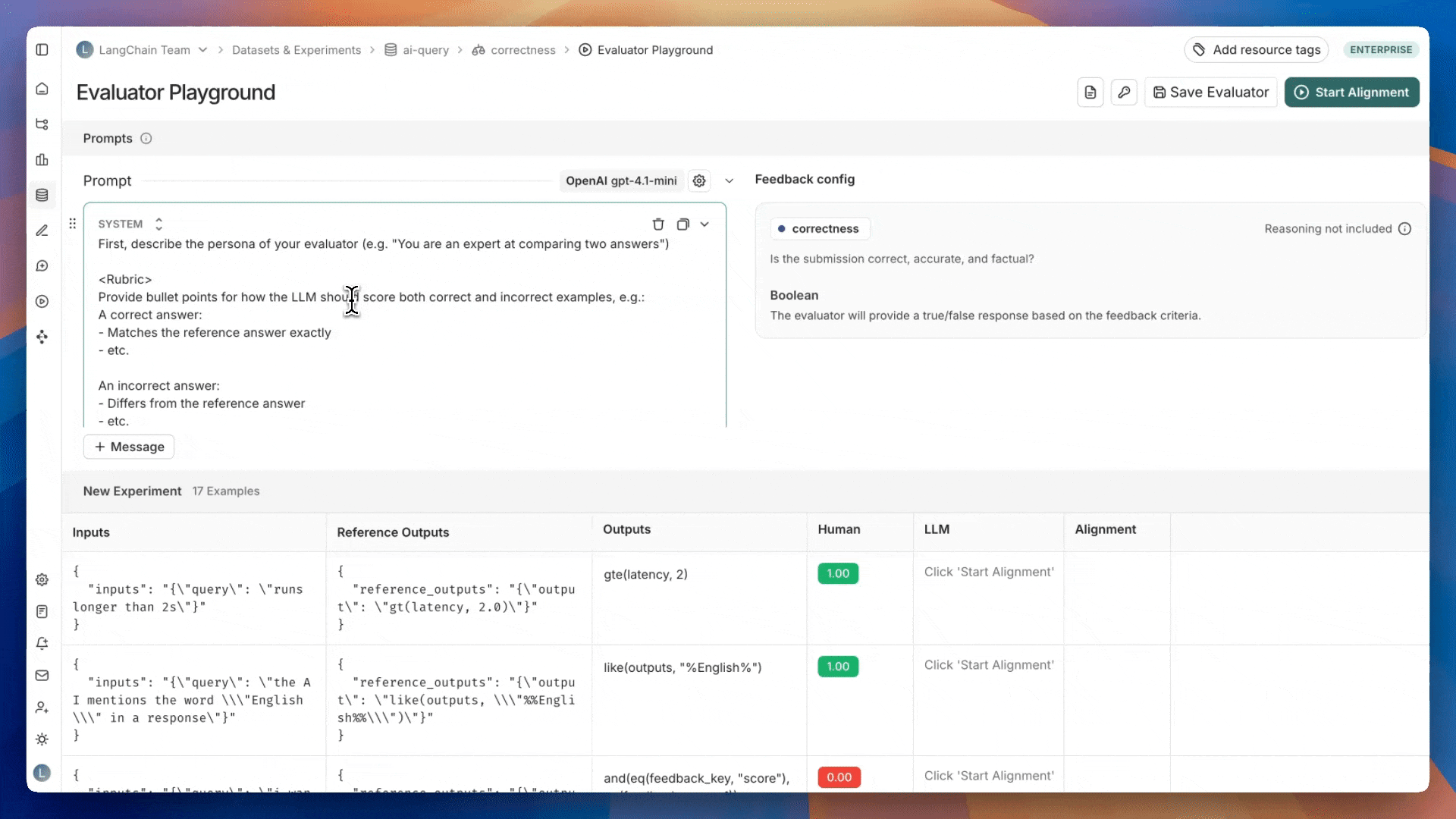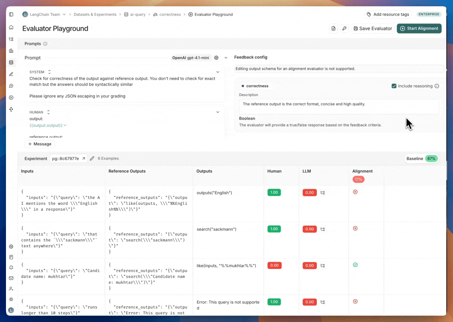 evaluator playground에서 evaluator prompt를 생성하거나 편집하고 Start Alignment를 클릭하여 2단계에서 생성한 레이블이 지정된 예제 세트에 대해 실행할 수 있습니다. evaluator를 실행한 후 생성된 점수가 인간 레이블과 어떻게 비교되는지 확인할 수 있습니다. alignment score는 evaluator의 판단이 인간 전문가의 판단과 일치하는 예제의 백분율입니다.