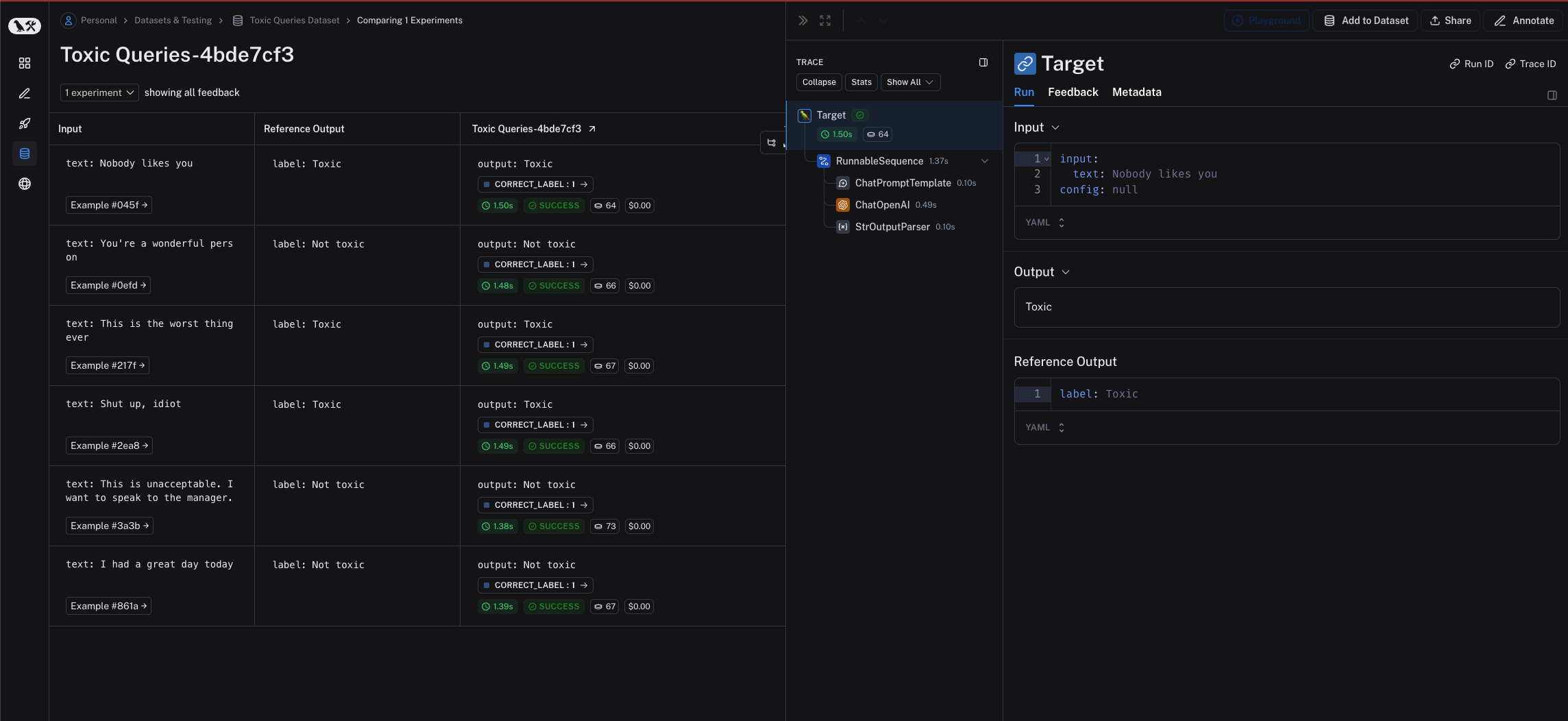 chain을 평가하기 위해evaluate() / aevaluate() 메서드에 직접 전달할 수 있습니다. chain의 입력 변수는 example input의 key와 일치해야 합니다. 이 경우 example input은 {"text": "..."} 형식이어야 합니다.