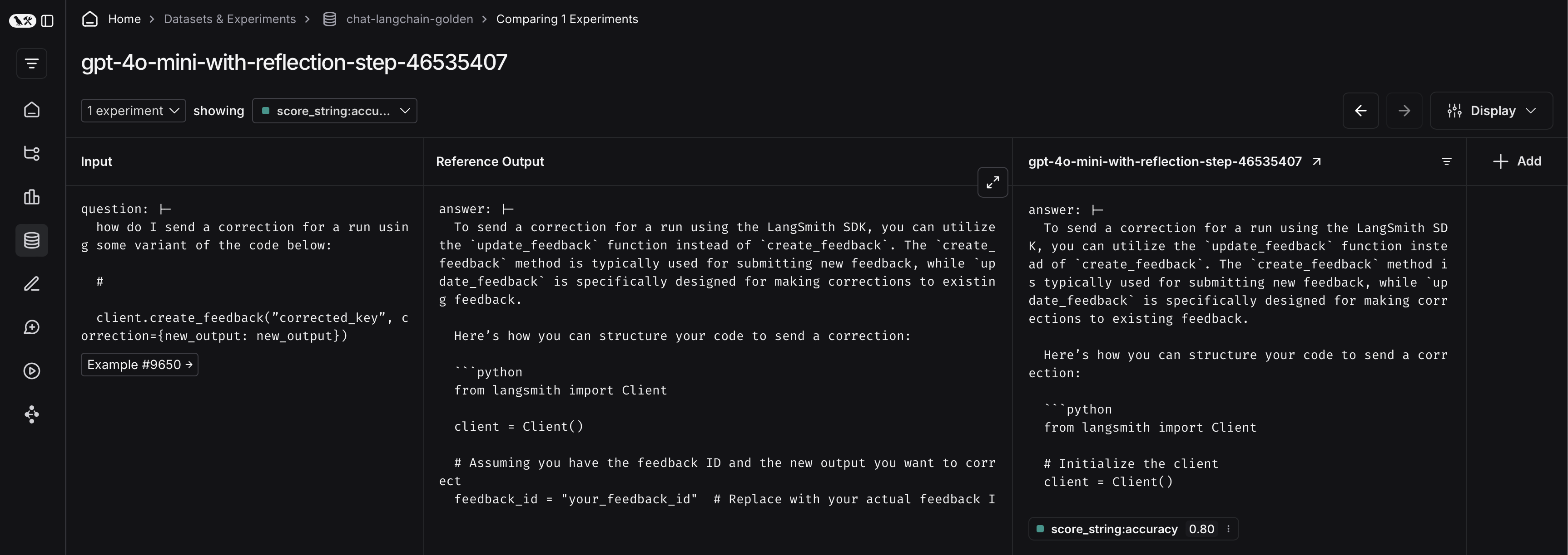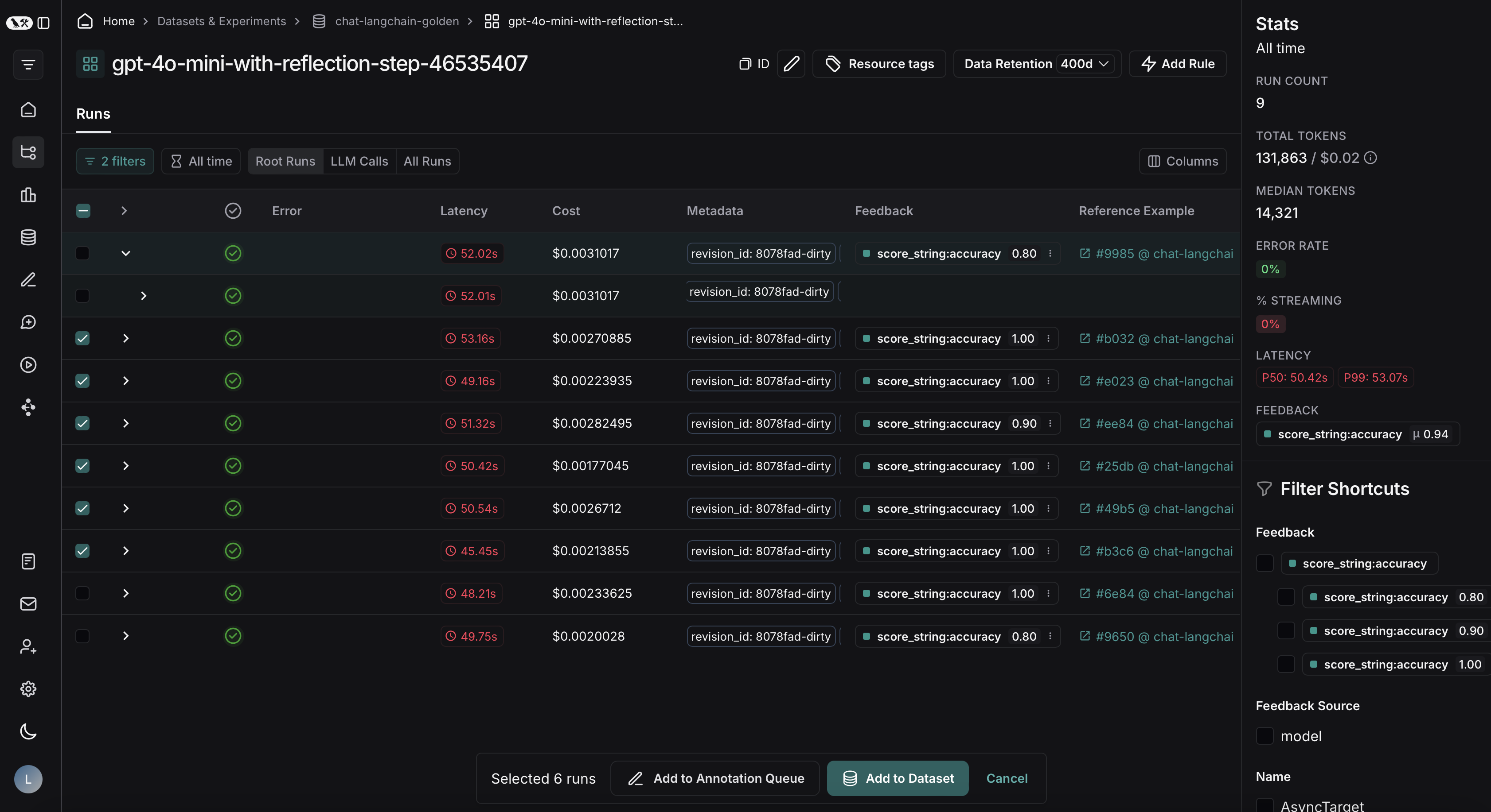 LangSmith에서 오프라인 평가를 실행한 후 일부 평가 기준을 충족하는 trace를 데이터셋으로 내보낼 수 있습니다.View experiment traces