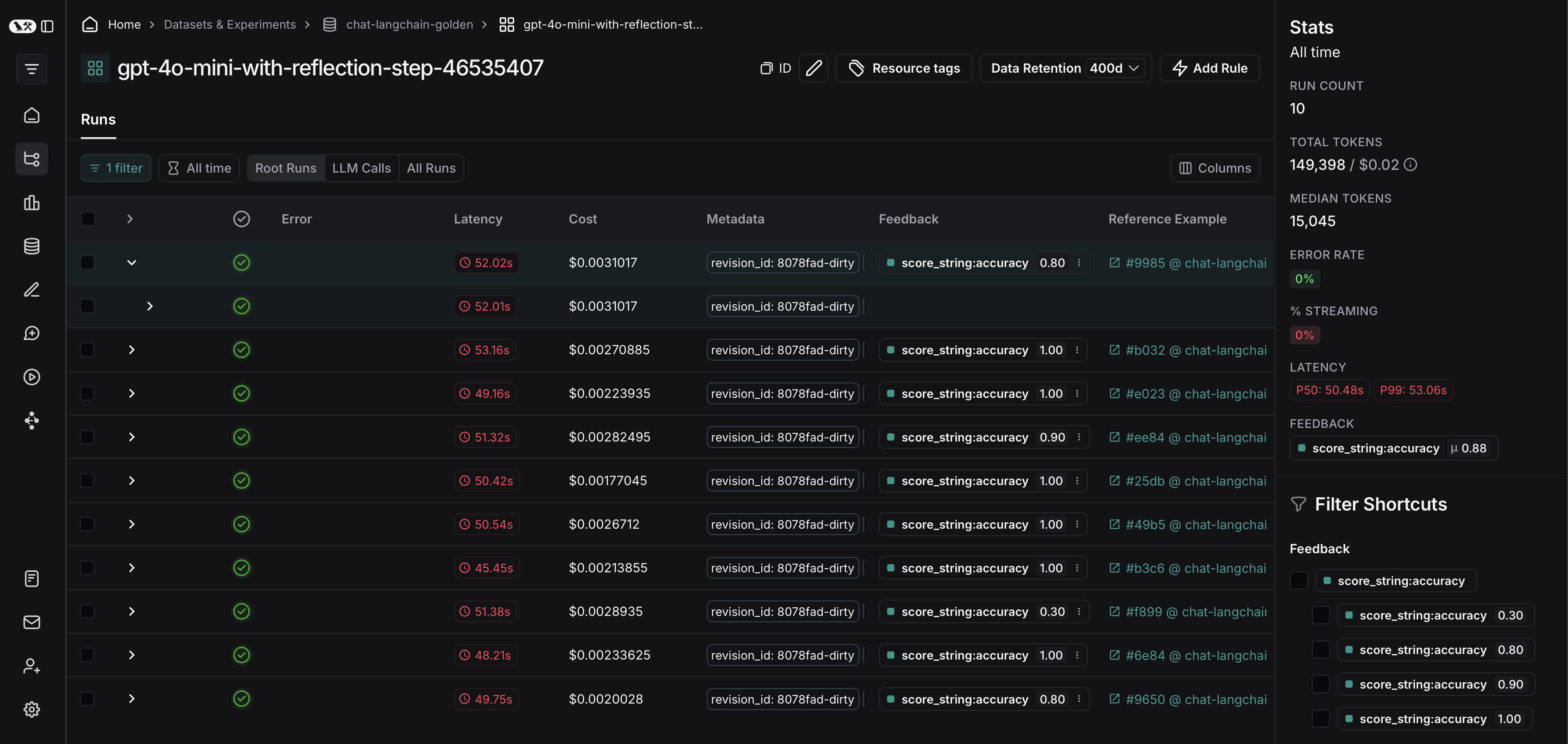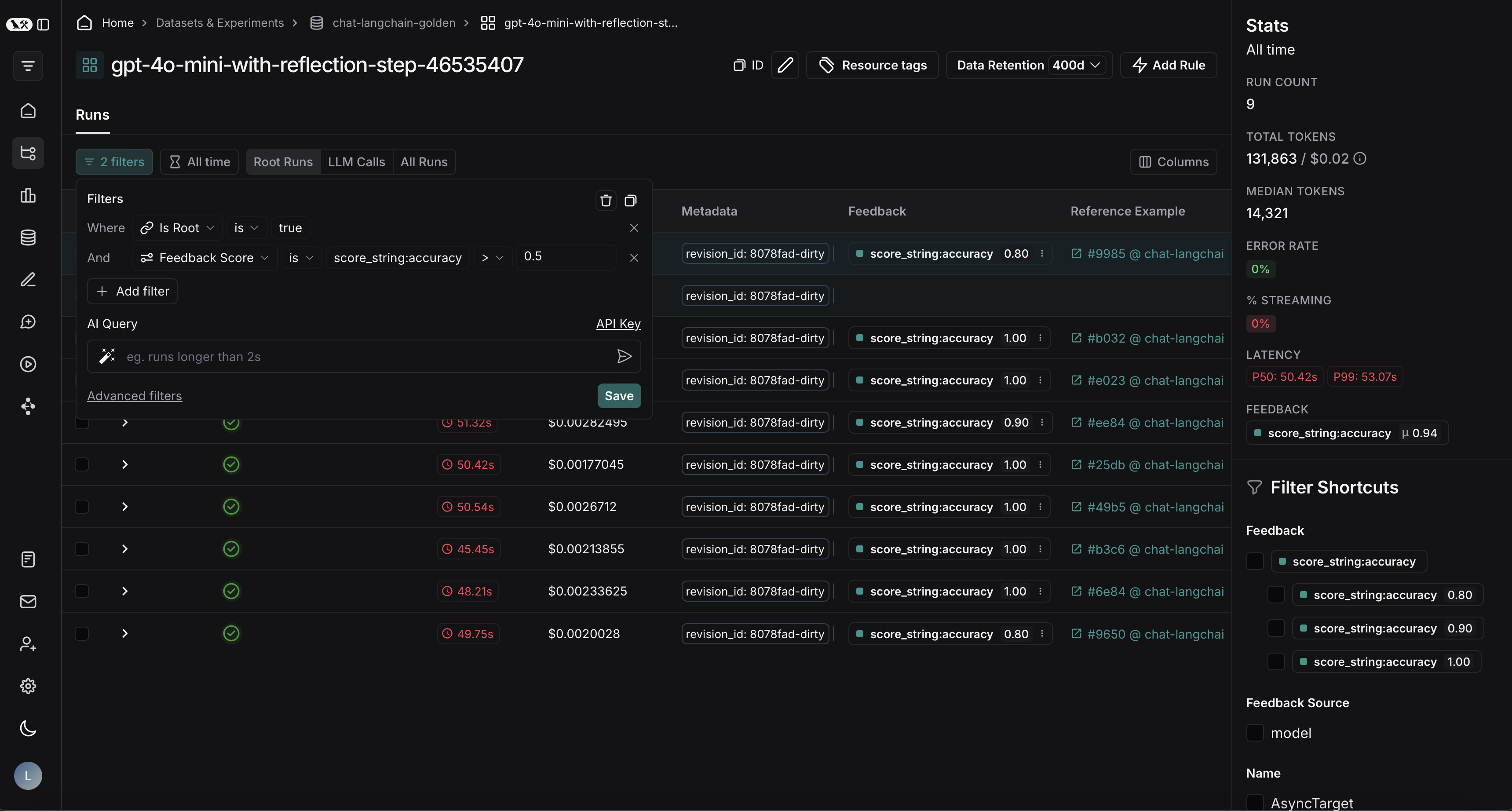 여기에서 평가 기준에 따라 trace를 필터링할 수 있습니다. 이 예제에서는 0.5보다 큰 accuracy 점수를 받은 모든 trace를 필터링합니다.