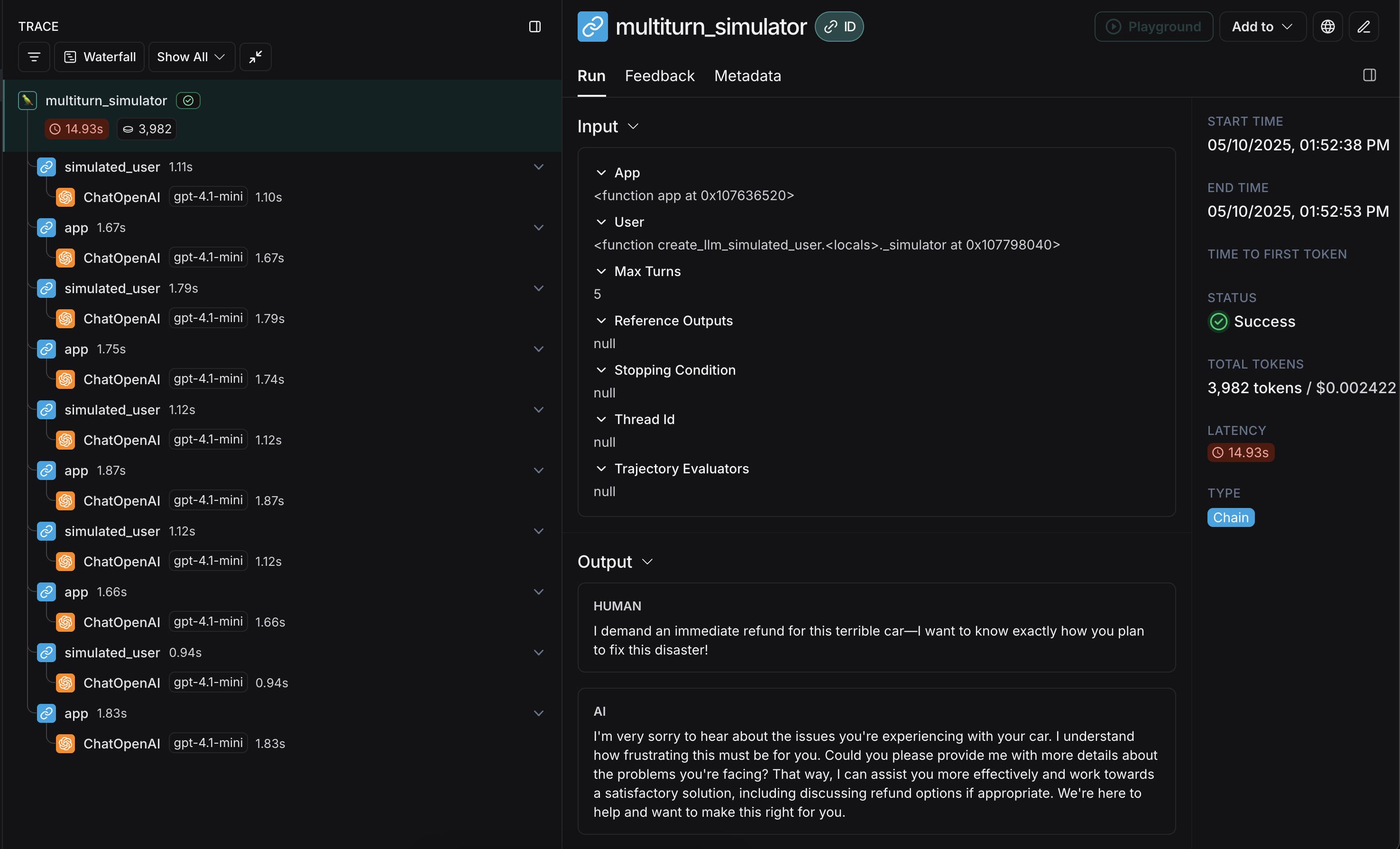 축하합니다! 첫 번째 다중 턴 시뮬레이션을 실행했습니다. 다음으로 LangSmith experiment에서 실행하는 방법을 다루겠습니다.