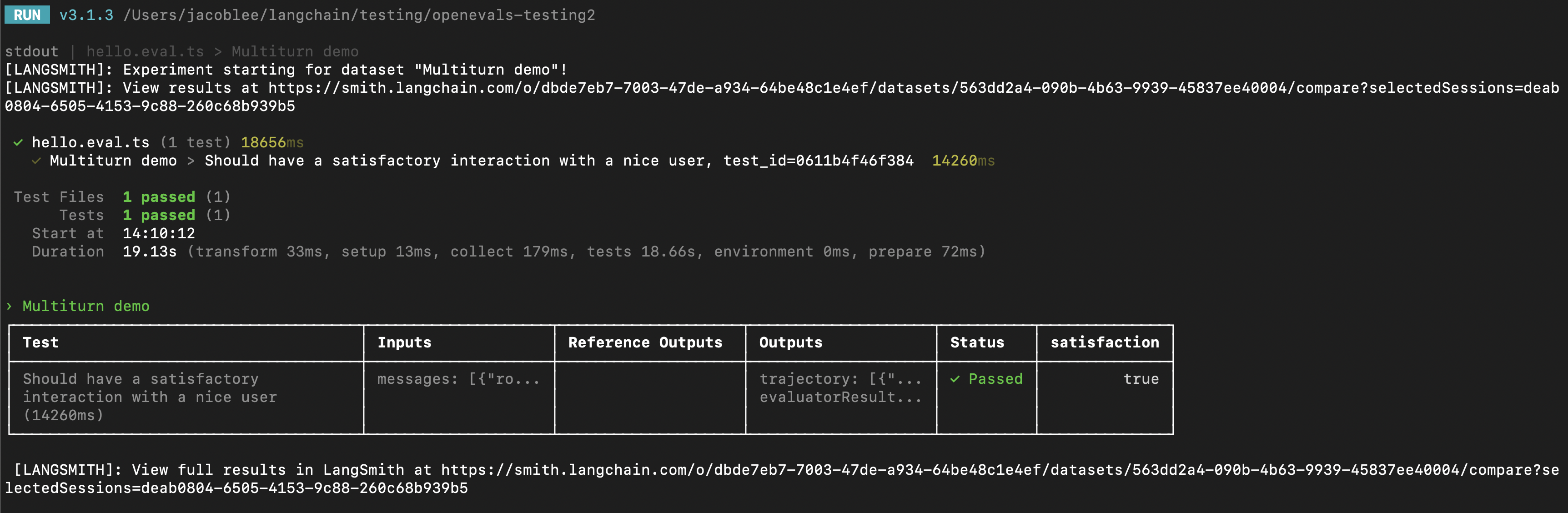 다중 턴 시뮬레이션의 결과를 LangSmith experiment의 일부로 사용하여 시간 경과에 따른 성능과 진행 상황을 추적할 수 있습니다. 이 섹션에서는 LangSmith의pytest (Python 전용), Vitest/Jest (JS 전용) 또는 evaluate 러너 중 하나 이상에 익숙한 것이 도움이 됩니다.