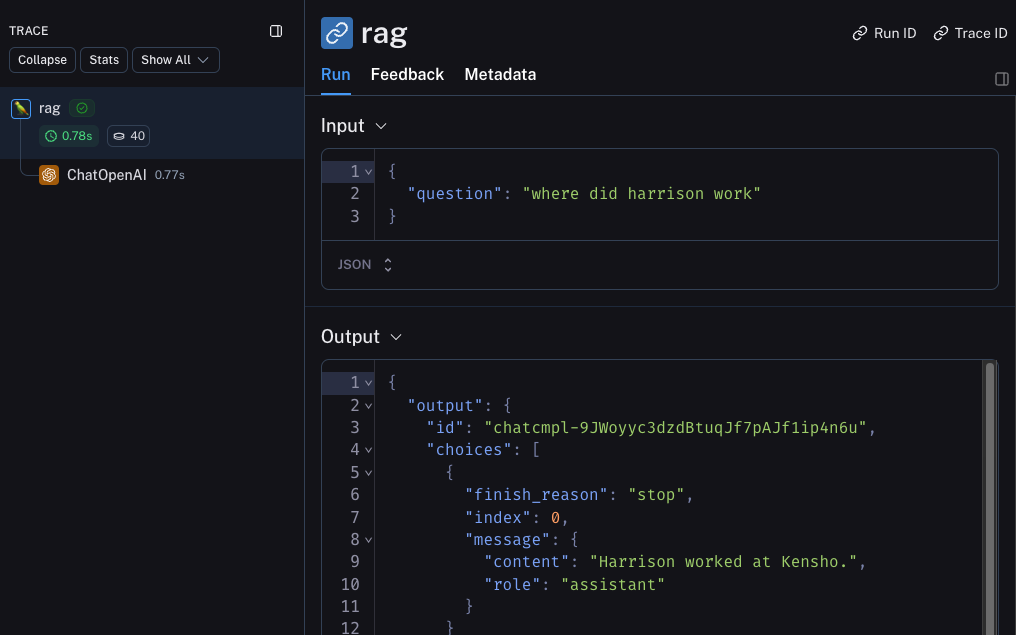 메타데이터 기록을 시작하는 것도 좋은 아이디어입니다. 이를 통해 앱의 다양한 속성을 추적할 수 있습니다. 이는 주어진 결과를 생성하는 데 사용된 앱의 버전이나 변형을 알 수 있도록 하는 데 중요합니다. 이 예제에서는 사용된 LLM을 기록합니다. 종종 다양한 LLM을 실험할 수 있으므로 해당 정보를 메타데이터로 갖는 것이 필터링에 유용할 수 있습니다. 이를 수행하기 위해 다음과 같이 추가할 수 있습니다:rag 함수에 @traceable(metadata={"llm": "gpt-4o-mini"})를 추가한 것을 주목하세요.