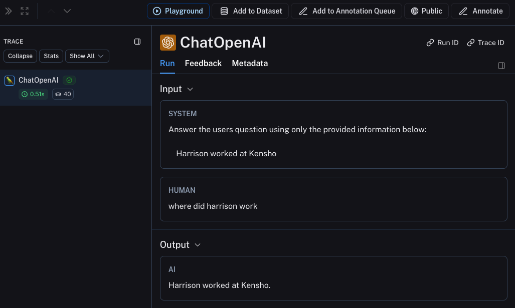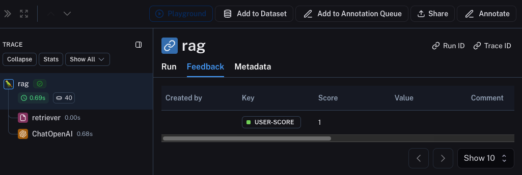 베타 테스트 중 좋은 관찰 가능성을 갖는 데 있어 큰 부분은 피드백을 수집하는 것입니다. 수집하는 피드백은 종종 애플리케이션에 따라 다르지만 최소한 간단한 좋아요/싫어요는 좋은 시작입니다. 피드백을 기록한 후에는 이를 해당 피드백을 발생시킨 run과 쉽게 연결할 수 있어야 합니다. 다행히 LangSmith는 이를 쉽게 수행할 수 있게 해줍니다. 먼저 앱에서 피드백을 기록해야 합니다. 이를 수행하는 쉬운 방법은 각 run에 대한 run ID를 추적한 다음 이를 사용하여 피드백을 기록하는 것입니다. run ID를 추적하는 것은 다음과 같습니다:Metadata 탭을 클릭하여 각 run과 연결된 피드백을 볼 수 있습니다. 이것과 같이 보일 것입니다
