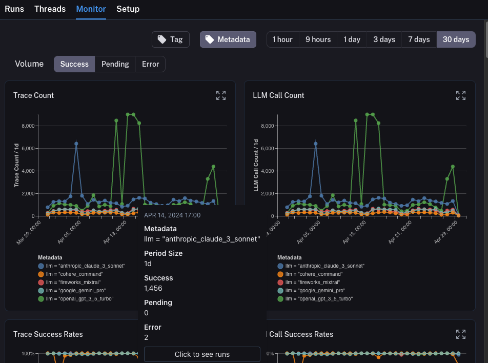 llm이었습니다. 모니터링 차트를 ANY 메타데이터 속성으로 그룹화하고 시간 경과에 따라 그룹화된 차트를 즉시 얻을 수 있습니다. 이를 통해 다양한 LLM(또는 프롬프트 또는 기타)을 실험하고 시간 경과에 따른 성능을 추적할 수 있습니다.