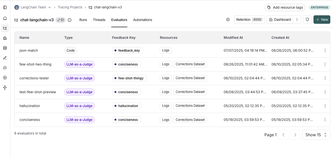 평가자 상태 확인트레이싱 프로젝트 내 Evaluators 탭에서 생성한 평가자의 Logs 버튼을 클릭하여 마지막 실행 시점을 확인할 수 있습니다. 평가자에 전달된 데이터 확인