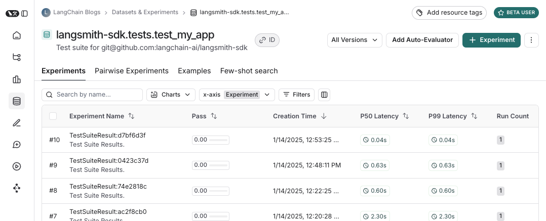 LangSmith에서 테스트를 추적하려면 @pytest.mark.langsmith decorator를 추가하세요. 모든 decorator가 적용된 test case는 dataset example과 동기화됩니다. 테스트 스위트를 실행하면 dataset이 업데이트되고 각 test case에 대한 결과가 포함된 새로운 experiment가 생성됩니다.