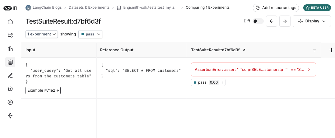 assert sql == expected # <-- Test pass/fail status automatically logged to LangSmith under 'pass' feedback key