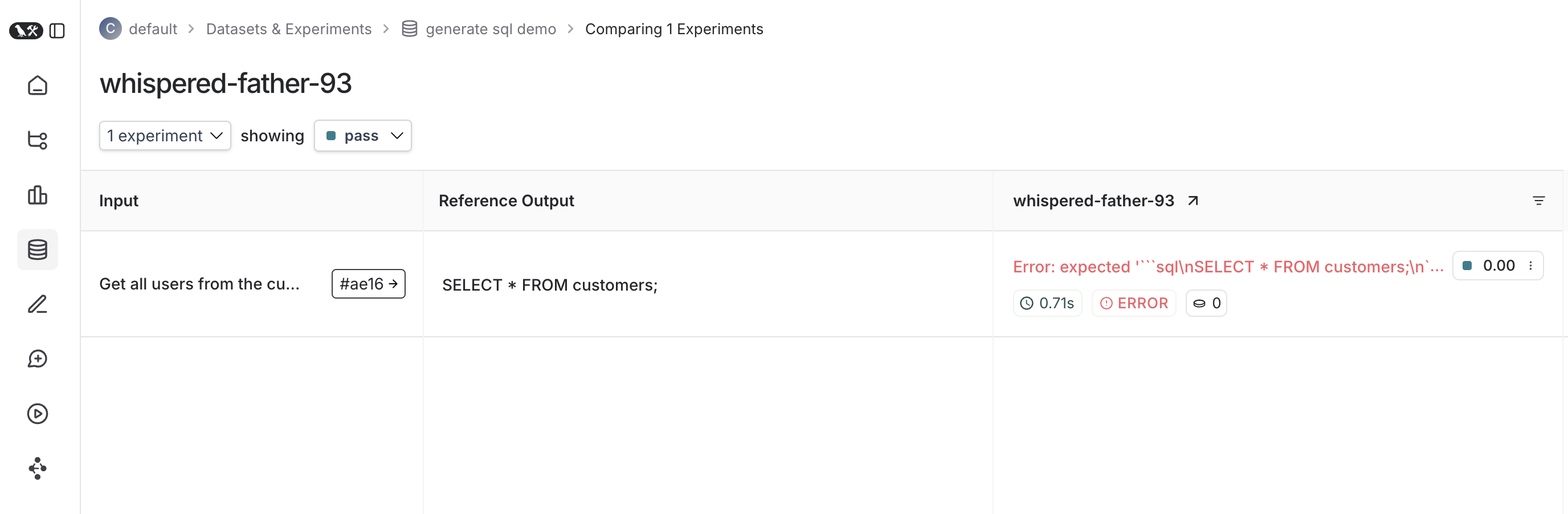 expect(sql).toEqual(referenceOutputs?.sql); // <-- Assertion result logged under 'pass' feedback key
