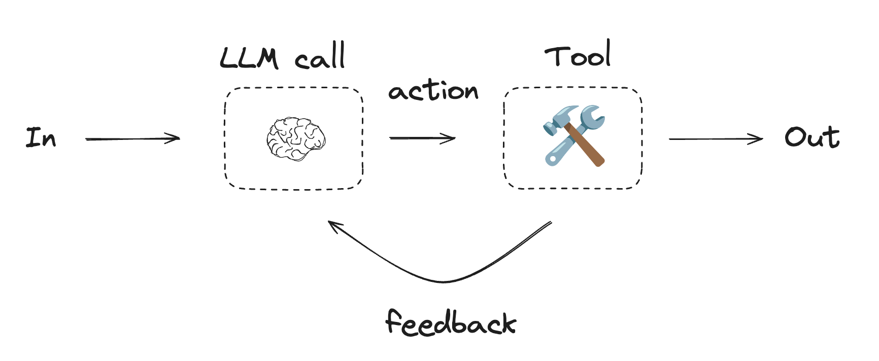 Agent는 일반적으로 tool을 사용하여 작업을 수행하는 LLM으로 구현됩니다. 연속적인 피드백 루프에서 작동하며, 문제와 솔루션을 예측할 수 없는 상황에서 사용됩니다. Agent는 workflow보다 더 많은 자율성을 가지며, 사용하는 도구와 문제 해결 방법에 대한 결정을 내릴 수 있습니다. 사용 가능한 도구 세트와 agent의 동작 방식에 대한 가이드라인을 여전히 정의할 수 있습니다.